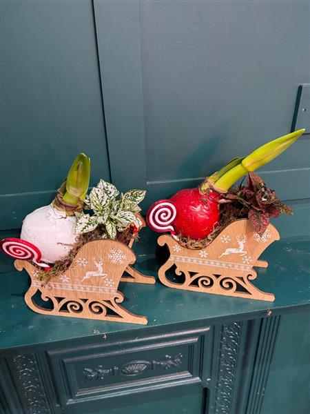 A lovely themed gift comprising a large amaryllis bulb and complimentary plant with festive decoration.
