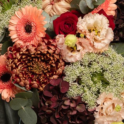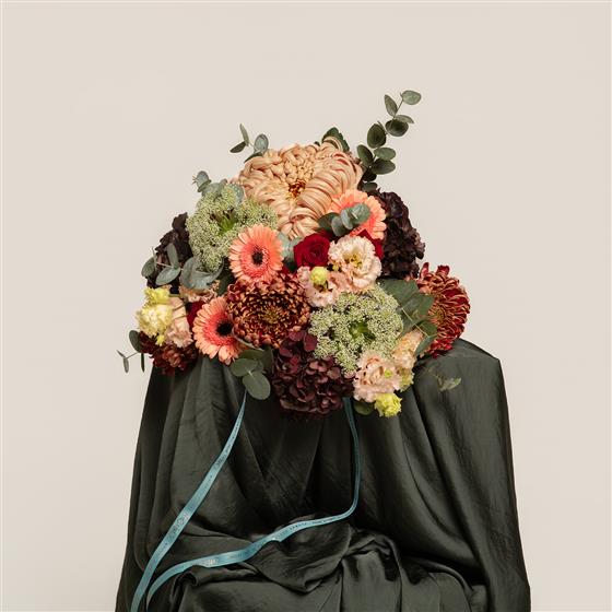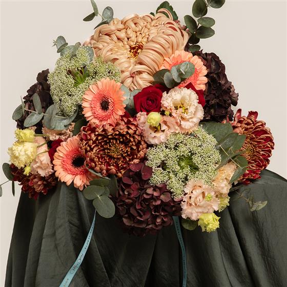 Capture the fleeting magic of the season with our Autumn Amber & Ash Bouquet. This artful arrangement is a tribute to the landscape's transformation, where vibrant leaves smolder in shades of crimson, gold, and rustic brown. More than just a bouquet, it's a vessel for the cosy, comforting feeling of autumn itself.