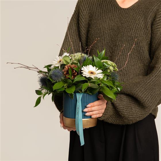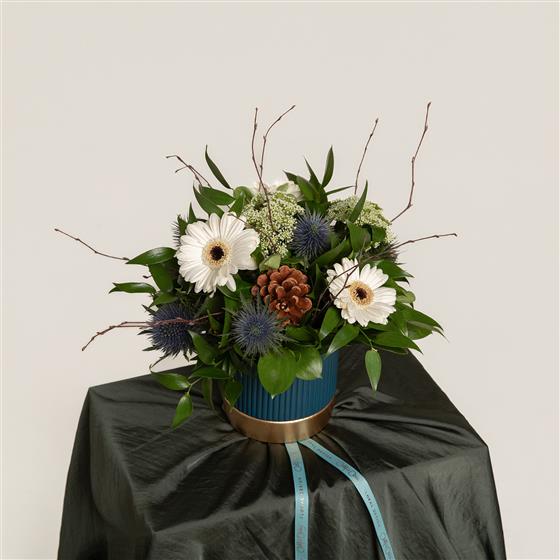 Meet the Azure Crest pot: a bold fusion of deep cobalt and gleaming gold. This contemporary vessel is designed to make a statement, its luxurious colours providing the perfect foundation for a minimalist yet striking floral arrangement. The crisp white blooms and architectural blue thistle pop dramatically against the dark green foliage, creating a look that is both refined and effortlessly cool.