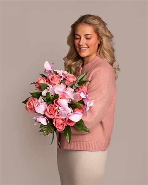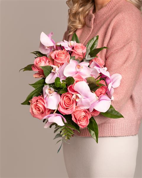 Plump, velvety pink roses form the heart of this bouquet. Their generous blooms and soft, intoxicating fragrance speak a timeless language of admiration and affection. Interwoven amongst them are elegant stems of light pink phalaenopsis orchids, often called "moth orchids" for their delicate, winged appearance. Their graceful blooms add an element of sophisticated wonder, with a modern, sculptural quality that elevates the entire design.