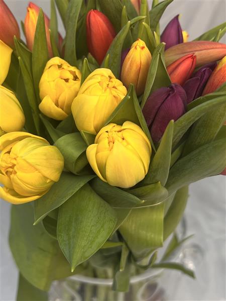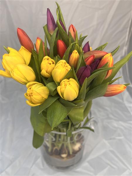 20 fab fresh British Tulips gift wrapped and delivered with the bulb still attached, so they can be planted after flowering.