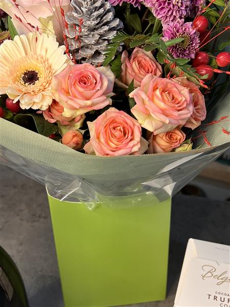 Our gift set comprises of A pretty hand crafted bouquet, a 75cl full size bottle of Prosecco and a box of cocoa dusted truffles.