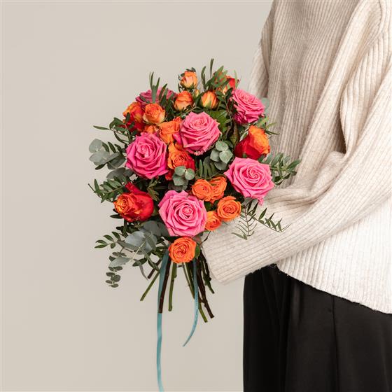 Where soft romance meets vibrant warmth. The 'Chroma Bloom' bouquet is a captivating dance of delicate pink roses and richly-hued orange roses. This striking combination symbolises both admiration and passionate energy, making it the ultimate gesture for a love that is both tender and deeply felt. Artfully arranged to highlight the beautiful contrast, this bouquet is a true statement piece, guaranteed to ignite feelings of joy and devotion.