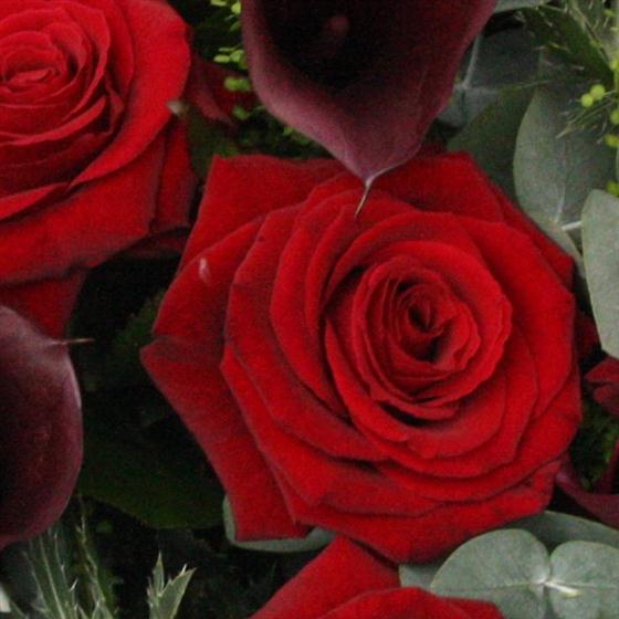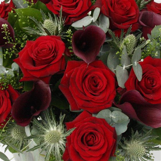 A magnificent bouquet of long stemmed red roses with deep magenta calla lilies.