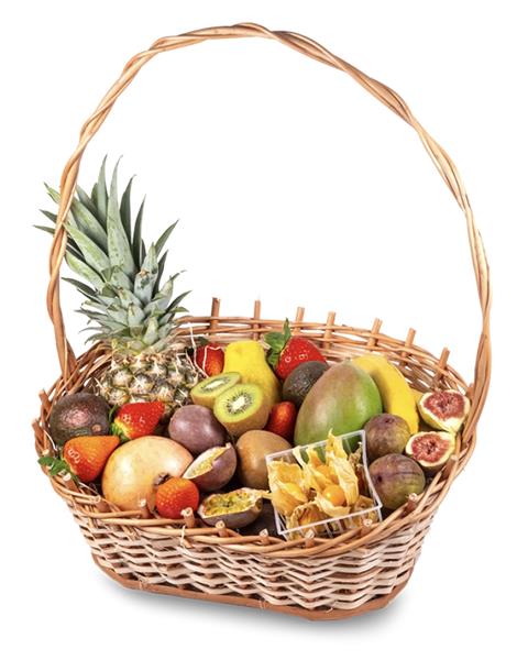 A fresh fruity selection of Pineapple, Banana, Strawberry, Kiwi, Fig, Mango, Passionfruit, Avocado, presented in a wicker basket
