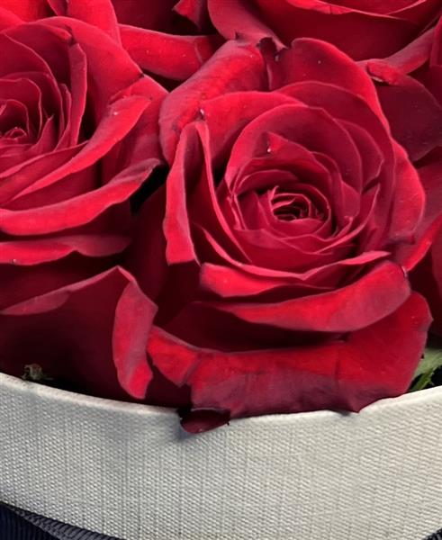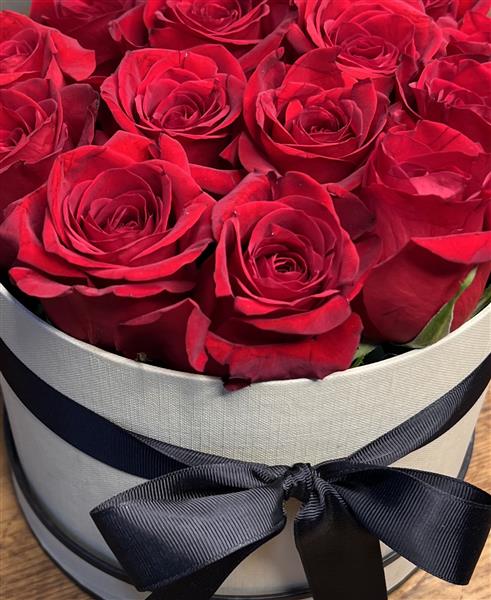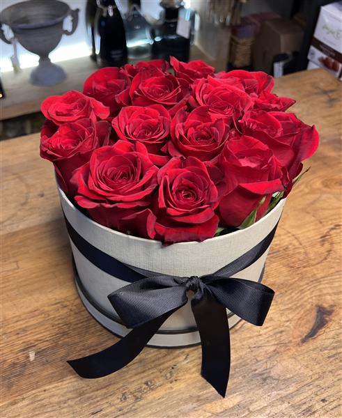 Our hatbox of roses is an elegant display that is bursting with beautiful large headed roses. A symbol of love and affection the Red Rose is the epitome of class and style.