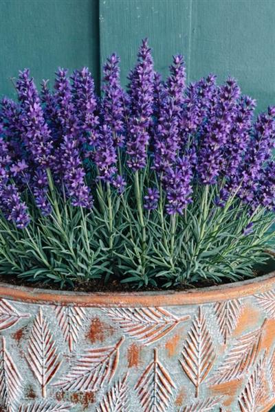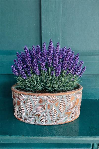 Feature pot filled with highly scented lavender plants. The ceramic pot is the perfect accompaniment for lavender plants, they come with healthy plants ready to burst into flower, after flowering they can be transplanted into the garden for beautiful colour and scent year after year.