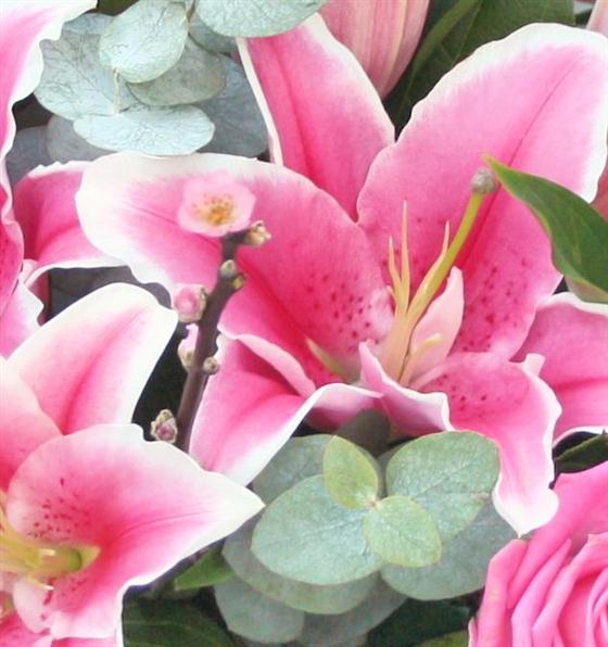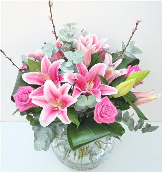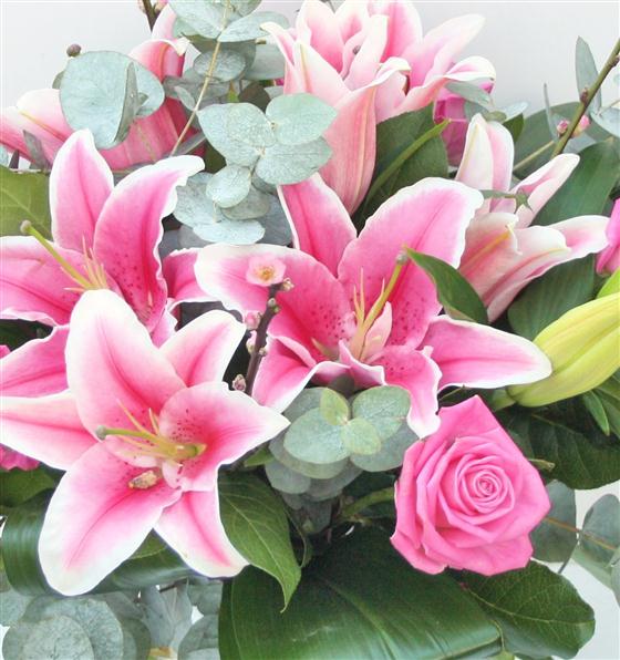 A beautiful bouquet that includes large pink oriental lily's and pink roses finished with pink cherry blossom and eucalyptus. Luxury contains 3 lily stems, standard 1.