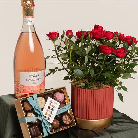 Indulge in a symphony of luxury. This exquisite collection begins with the effervescent joy of Rose Prosecco, a delicate pink fizz that dances on the palate. Accompanying it is a selection of artisanal luxury chocolates, each a masterpiece of flavor crafted to elevate the moment. The pièce de résistance is a deeply sensual red rose plant, elegantly potted to bloom again and again. More than a fleeting bouquet, it is a living testament to enduring love and passion. This is not just a gift; it's an unforgettable experience of taste, beauty, and timeless elegance.