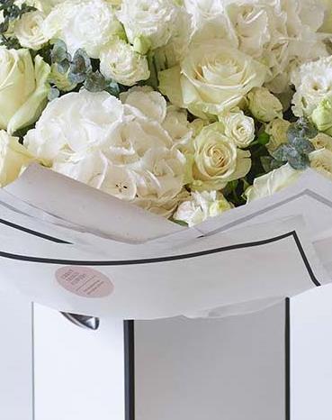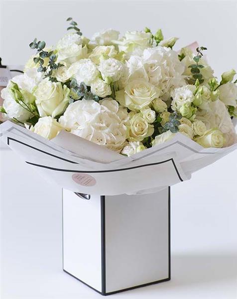 White long stemmed large headed roses, white hydrangea, lisianthus and eucalyptus make this a real winner. Classic colours and large in size, this Showstopper Bouquet is an amazing gift that's sure to impress.