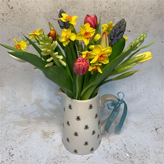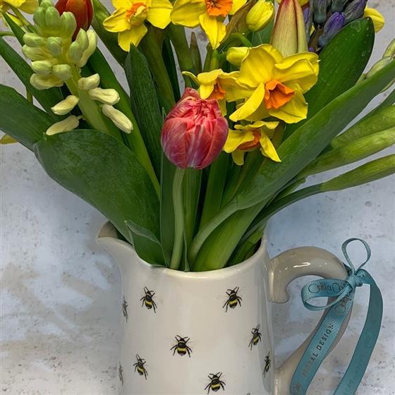 What a Bee-Utiful floral gift. Fresh seasonal flowers hand arranged in a wonderful Bee themed jug. The jug alone is a lovely thing, to be filled time and time again when the long lasting flowers that come with it have gone.