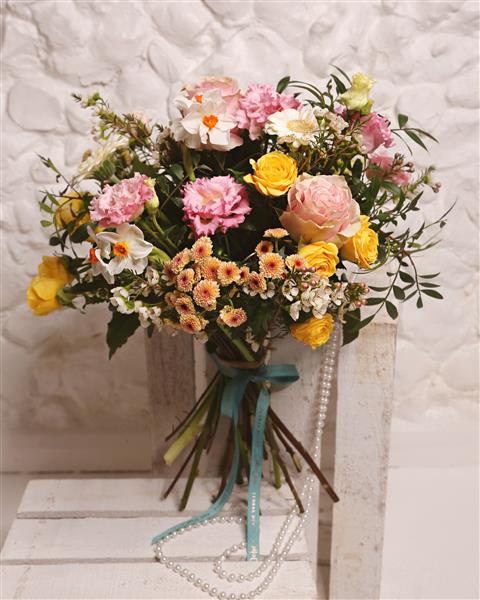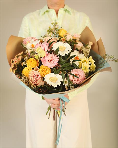 A decadent blend of blooms that captures the nostalgic joy of an old-fashioned ice cream parlour. Velvety pink roses and sunny yellow roses are the "cherry on top" of a creamy swirl of gerbera and ruffled lisianthus. This bouquet is a calorie-free indulgence, brimming with sweetness and vintage charm.