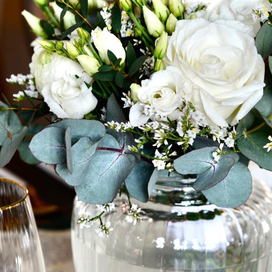 A carefully curated white arrangement ready to go in a vase, using white roses, lisianthus, spray roses and complimentary foliages, it is the finishing touch to any wedding table.