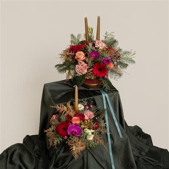 Elevate your holiday decor with a touch of serene sophistication. The Candlelit Celebration is a sculptural art piece designed to captivate. We've artfully intertwined pristine seasonal Reds and deep greens with the warm, radiant glow of candlelight. This arrangement embodies peaceful evenings and intimate celebrations, creating a mesmerizing focal point that invites quiet conversation and joyful moments. For the discerning host or as the ultimate corporate gift, The Winter Luminary is the epitome of curated holiday elegance.
