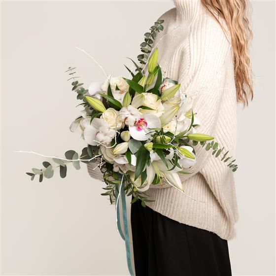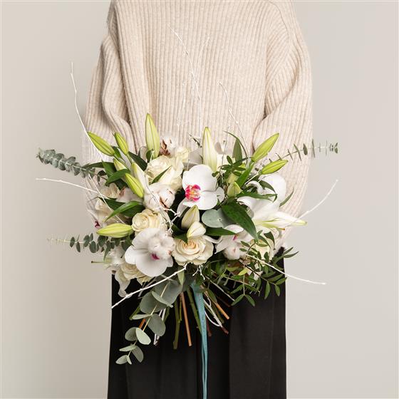 Capture the serene and mystical light of a moonlit night. The Winter Sanctum is a masterfully curated bouquet of pure white blooms, featuring elegant orchids, fragrant lilies, classic roses, and the rare textural beauty of cotton, all artfully woven with silvery eucalyptus. This otherworldly arrangement brings an atmosphere of calm sophistication and celestial beauty to any space. The ultimate gift for a wedding, a moment of peace, or to celebrate a love that is both pure and eternal.