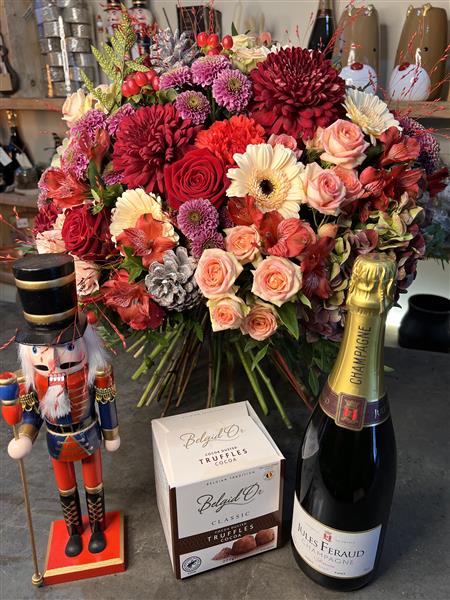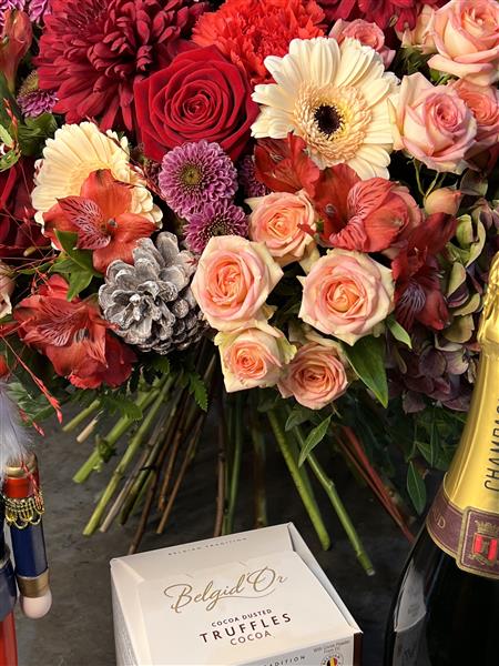 A gift set comprising of a fabulous hand tied bouquet, in either £100 or £200 size, accompanied by Nutcracker, a bottle of best quality Champagne with a box of our luxury cocoa dusted Belgian truffles.