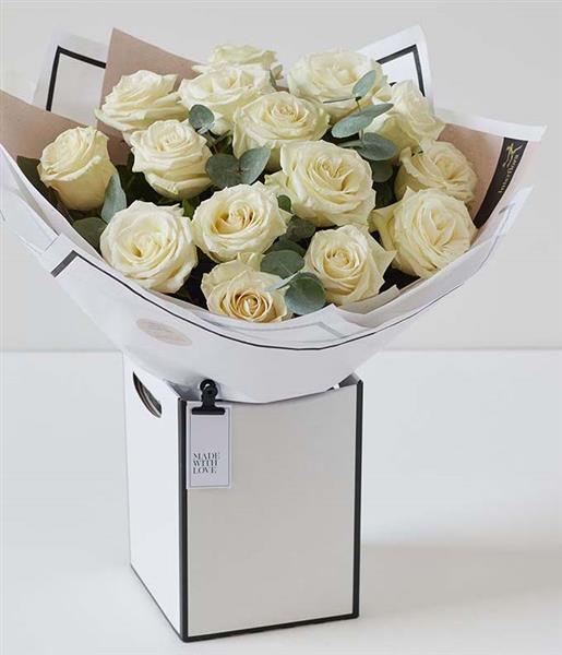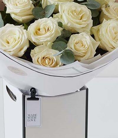 Choose from the classic dozen or upgrade to the luxury, we use only the very best long stemmed pure white roses and marry them with scented eucalyptus. This bouquet is hand delivered in water for freshness and is hand tied ready to go into a vase without the need for further arranging.