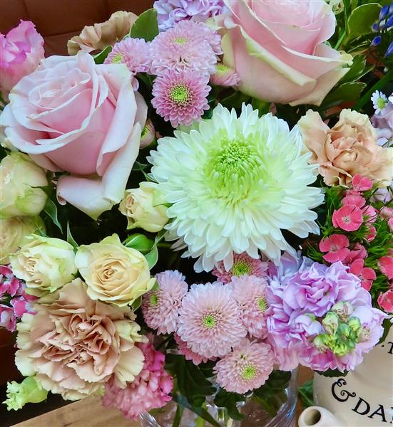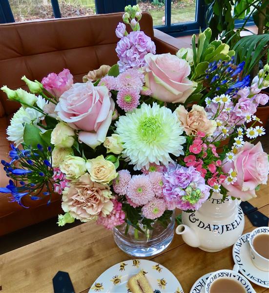 Vibrant blue agapanthus brings out the best in the Spray Roses, Dianthus, Santini with Sweet William Scented Stocks and Lisianthus. All the shapes and textures marry up to bring together a wonderful eclectic mix of Spring flowers turning towards early Summer.
