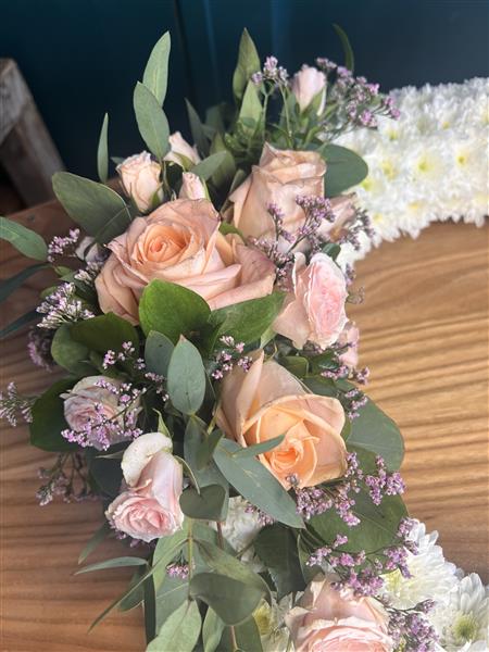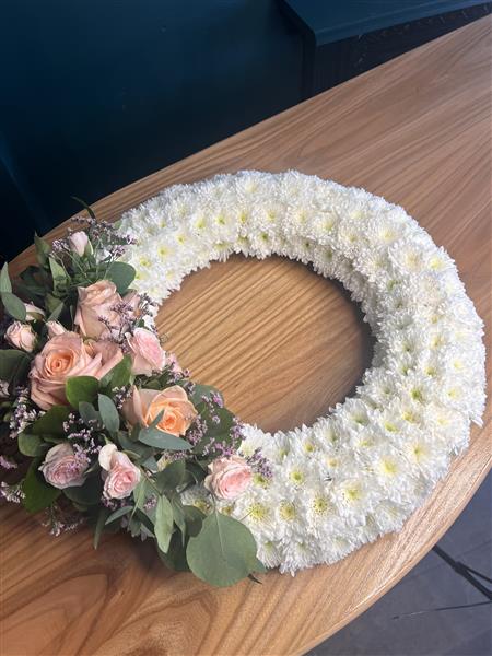 A classic white Chrysanthemum based wreath with a choice of coloured Rose spray.